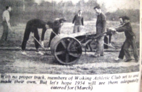 There are records of athletics on the area opposite the Wheatsheaf pub as early as 1865. That year, on 24 June, 1,200 people came from Guildford, Weybridge and Chertsey to see Moore beat Mills, handicapped by three yards (no first names, as they were professionals!) in a 200 yards race. Moore was contracted to run at Horsell the following year in a 400 yards race, for which he was paid £15; he lost the race, and later ran against Samson over 200 yards for £10, which caused a local resident to write a letter of protest to the Surrey Advertiser complaining of the rowdy behaviour of the crowd of 100.